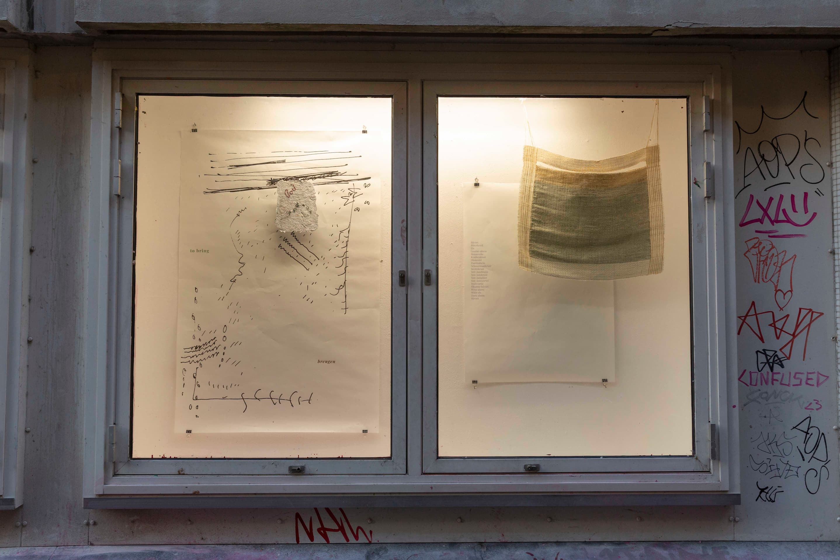 Exhibition with Annelotte Lammertse at Eight Cubic Meters, Amsterdam (NL) from October 6 until November 3. Works (printed text 594 x 841 mm, woven and tufted textiles, embroidery on handmade papers, ink drawings, stickers drawings) presented in ten windows in an alley between two busy shopping streets. Photos © Jordi de Vetten