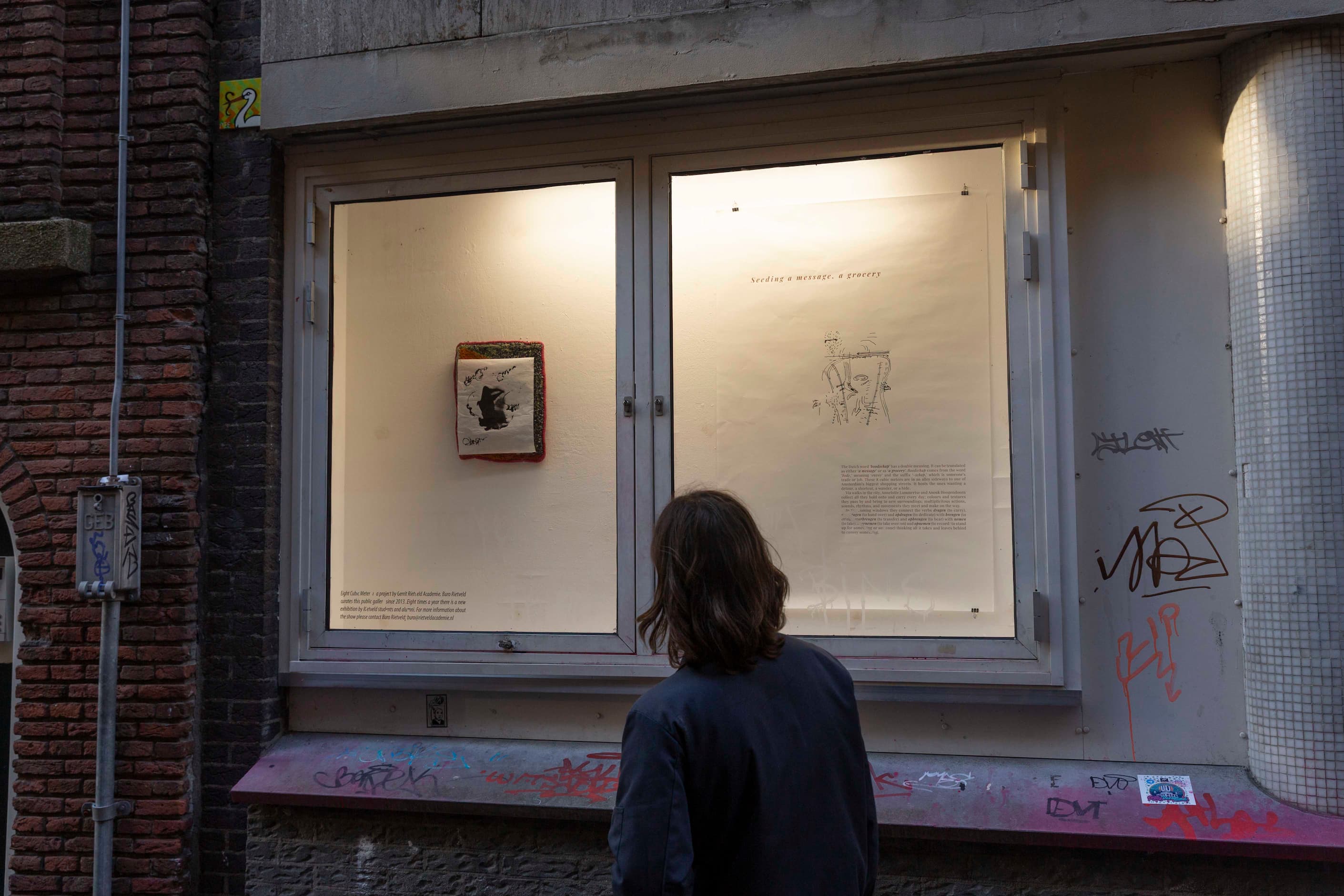 The Dutch word ‘een boodschap’ has a double meaning. It can be translated as either ‘a message’ or as ‘a grocery’. Boodschap comes from the word ‘bode,’ meaning ‘envoy’ and the suffix ‘-schap,’ which is someone’s trade or job. These 8 cubic meters are in an alley sideways to one of Amsterdam’s biggest shopping streets. It hosts the ones wanting a detour, a shortcut, a wander or a hide.